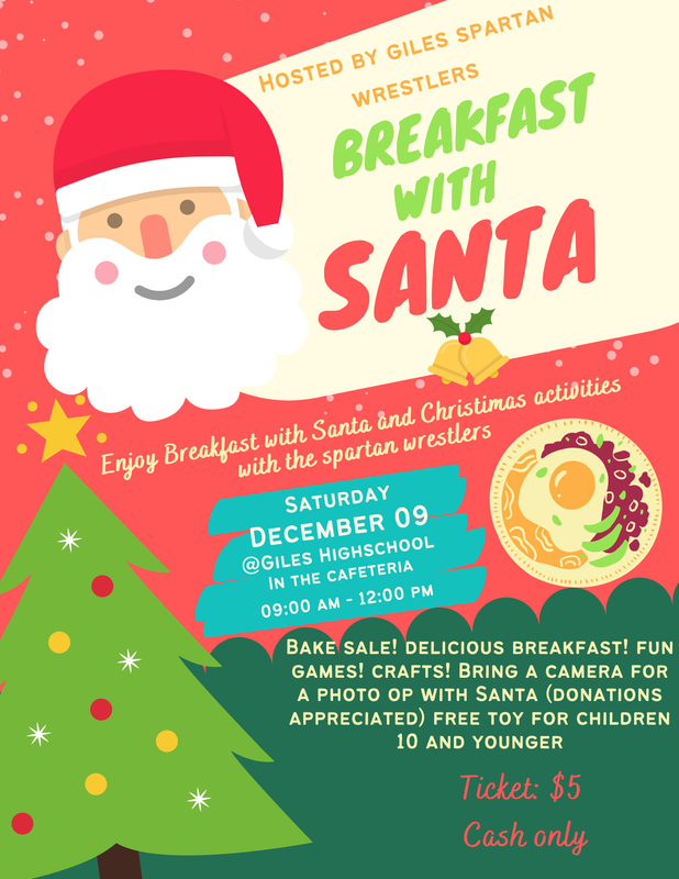 Enjoy breakfast with Santa and Christmas activities with the Giles Spartan Wrestling Team! Get breakfast, free craft and games. Kids 10 and under will also get a free toy. Write a letter to Santa and take a picture with Santa with your own phone or camera. There will also be a bake sale.