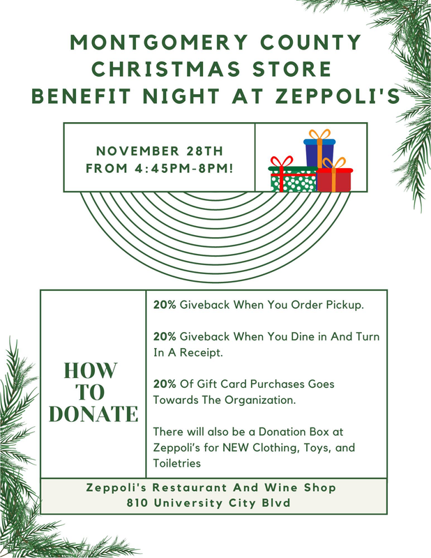 Zeppoli's presents a Fundraiser to Benefit the Montgomery County Christmas Store on Tuesday, November 28, 2023.