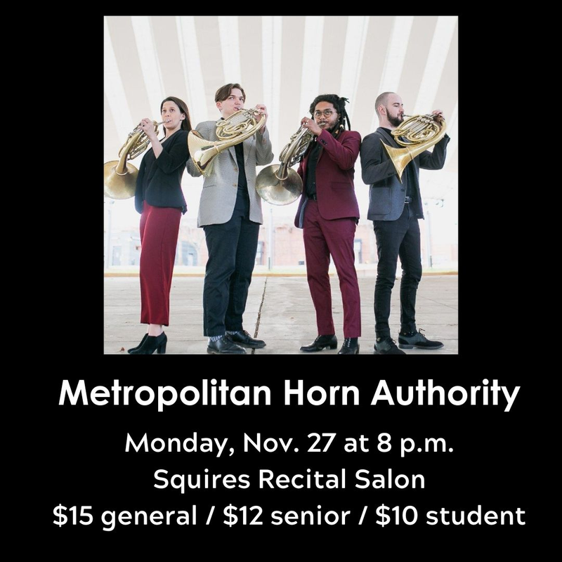 The Virginia Tech School of Performing Arts continues their Music on Mondays series featuring the Metropolitan Horn Authority in concert on Monday, November 27, 2023 inside the Squires Recital Salon on the campus of Virginia Tech.