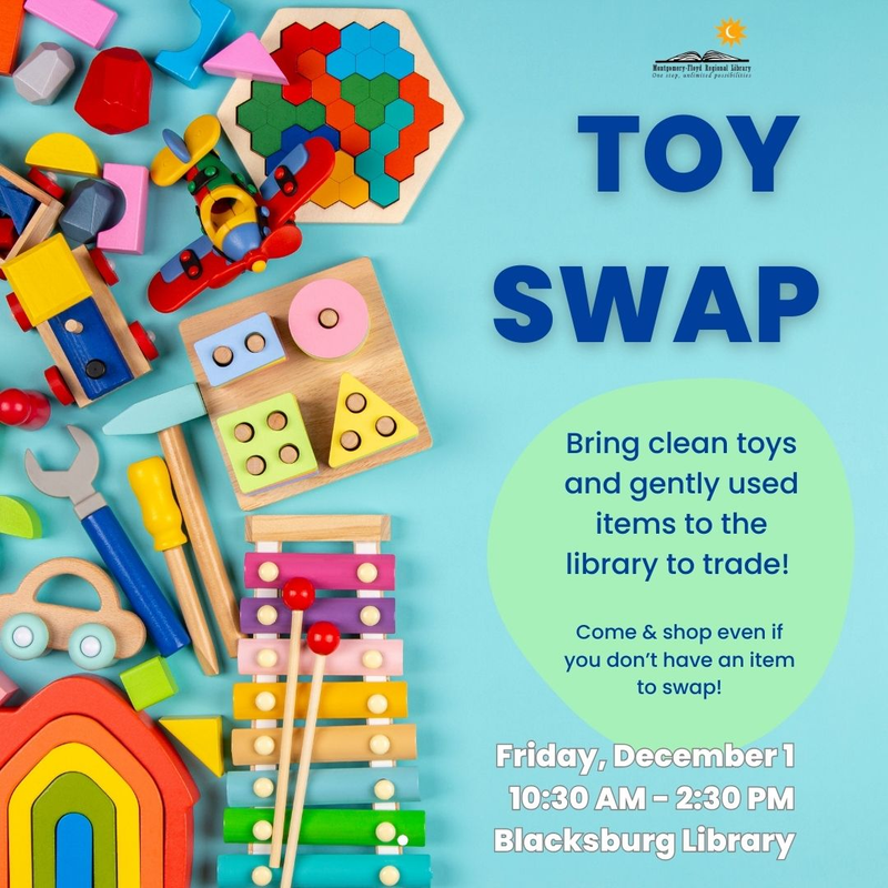 Just in time for the holidays, Blacksburg Library, is offering a Toy Swap! Bring clean toys and gently used items to the library to trade. Encourage your kids to pass on some of their old toys and look for toys that will be new to them.