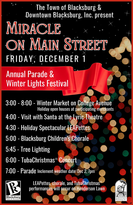 Downtown Blacksburg, Inc. and the Town of Blacksburg present the 2023 Winter Lights Fest with Tree Lighting Ceremony, Holiday Parade titled "Miracle on Main Street" and Santa Claus on Friday, December 1, 2023 at multiple locations throughout downtown Blacksburg, VA.