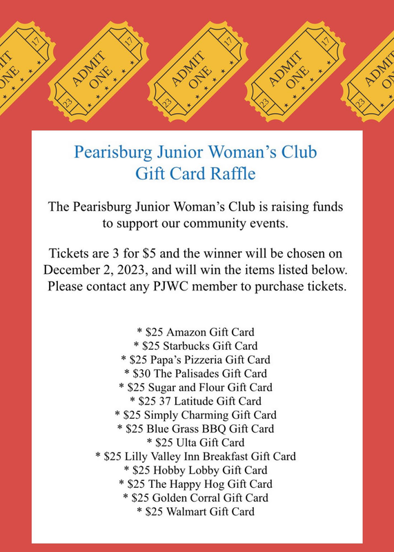 In addition the Pearisburg Junior Women's Club will be selling tickets for their Gift Card Raffle that will be drawn at the conclusion of the event. Raffle tickets are three for $5.00. To view the gift card raffle flyer, visit: