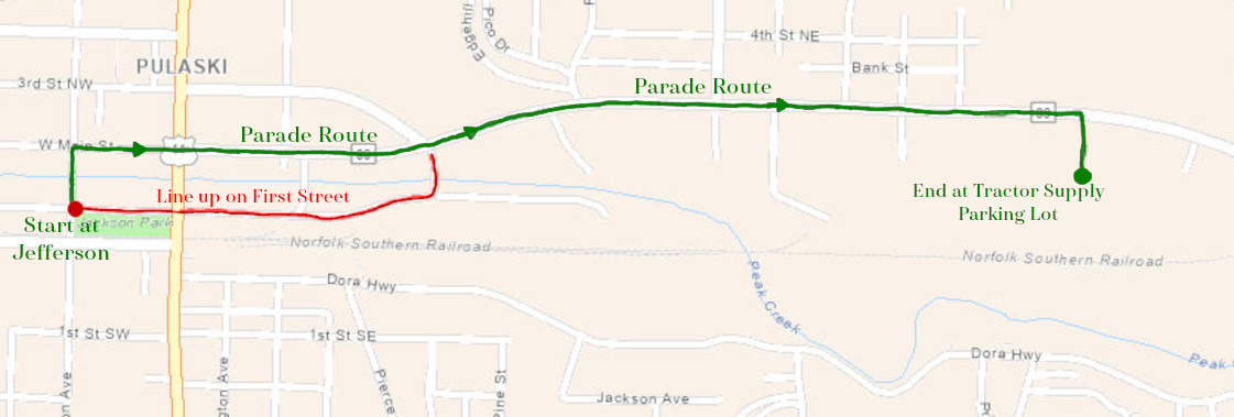 The parade route lines up on First Street and starts at Jefferson Street then moves along West Main Street ending at the Tractor Supply parking lot.