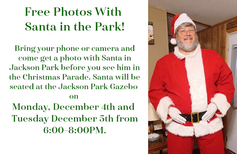 Bring your phone and/or camera and get a photo with Santa in Jackson Park before you see him in the Christmas Parade. Santa will be seated at the Jackson Park Gazebo.