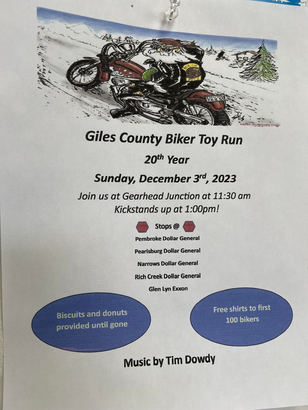 The 20th Giles County Biker Toy Run on Sunday, December 3, 2023 starting at GearHead Junction in Pembroke, VA.