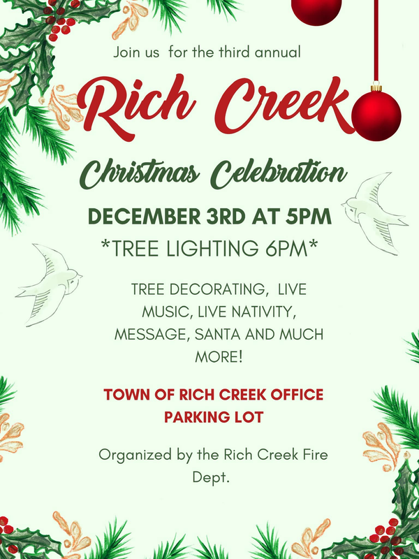 The Rich Creek Fire Department presents the 3rd Annual Tree Lighting and Rich Creek Christmas Celebration on Sunday, December 3, 2023 in the parking lot of the Rich Creek Municipal Building in Giles County, VA.