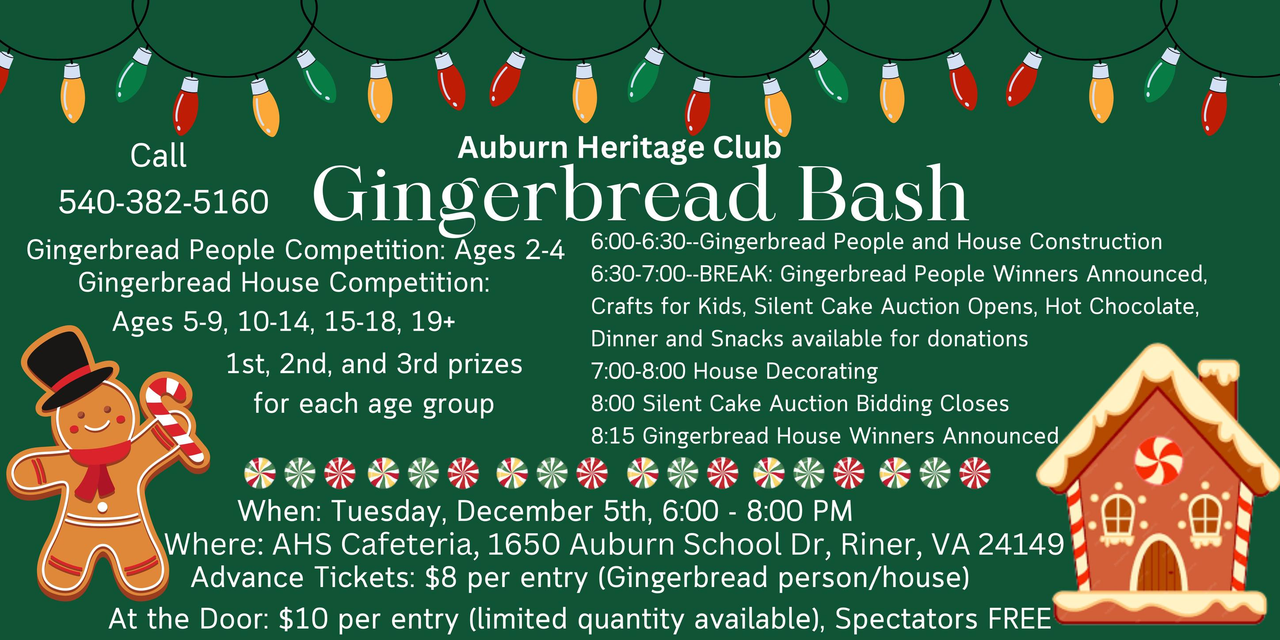 The Auburn High School Heritage Club presents the Inaugural Gingerbread Decorating Contest and Gingerbread Bash on Tuesday, December 5, 2023 at Auburn High School Cafeteria.