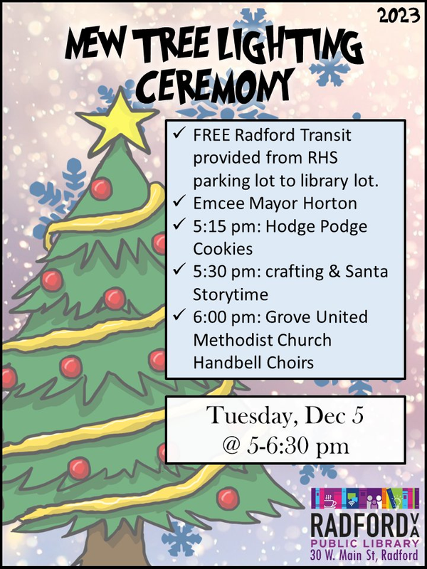 This year we will celebrate a new tree on the parking lot side of the library building. You won't be able to park in the library lot, but Radford Transit is on hand to offer rides from the high school parking lot to the library lot for free. Radford Transit will run continuously from 5:00-7:00 PM.