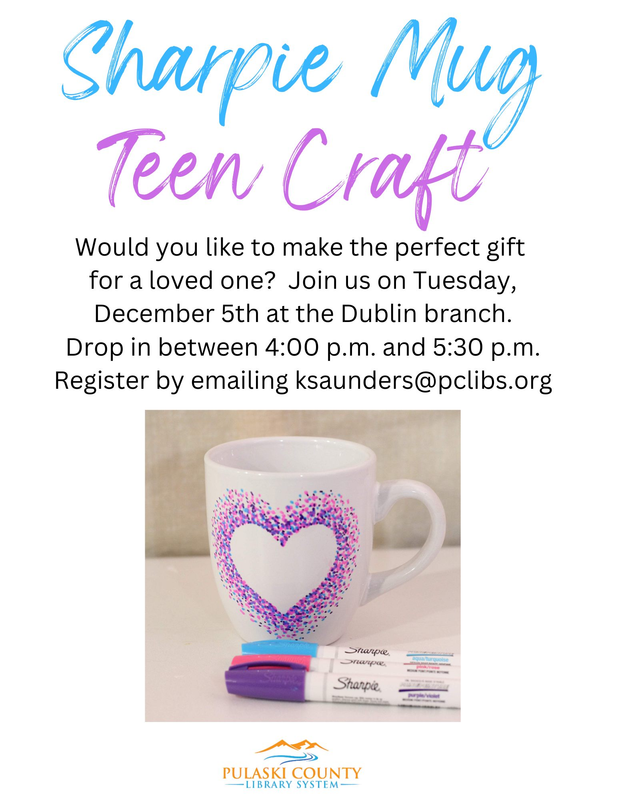 The Pulaski County Library presents the free craft "Sharpie Mug" for Teens on Tuesday, December 5, 2023.