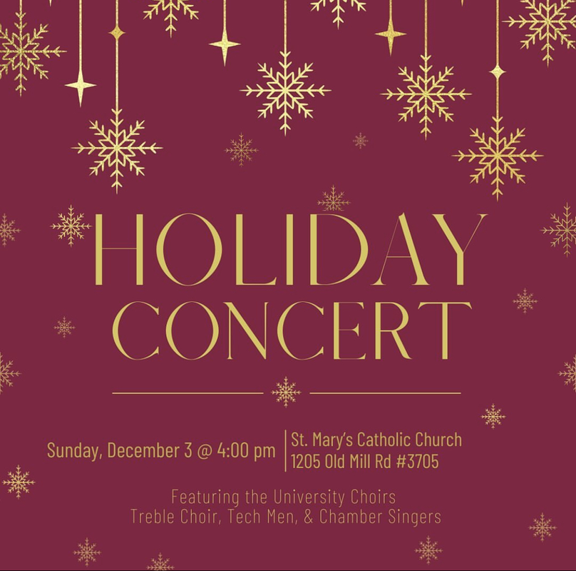 The Virginia Tech School of Performing Arts presents the Virginia Tech Holiday Concert featuring the University Choirs including the Treble Choir, Tech Men & Chamber Singers on Sunday, December 3, 2023 at St. Mary's Catholic Church.