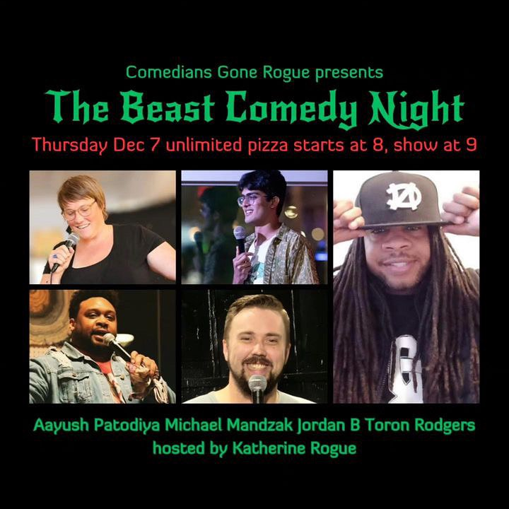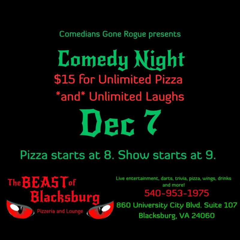 The Beast of Blacksburg Pizzeria & Bar presents The Beast Comedy Night with Unlimited Pizza on Thursday, December 7, 2023.