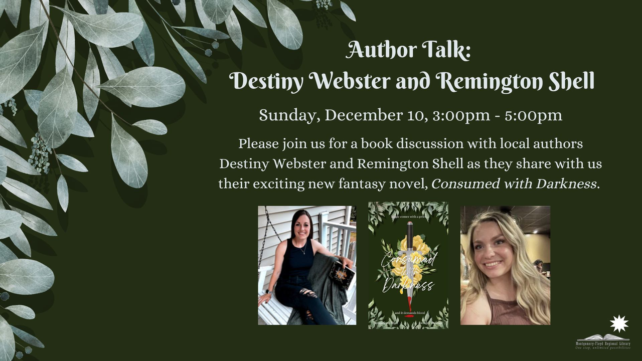 The Jessie Peterman Library presents an Author Talk with Destiny Webster and Remington Shell on Sunday, December 10, 2023.