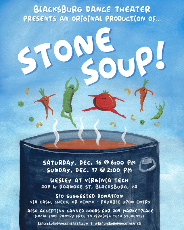 The Blacksburg Dance Theater presents the original production "Stone Soup!" with two performances on Saturday, December 16, 2023 at 6:00 PM and on Sunday, December 17, 2023 at 2:00 PM at the Wesley Foundation on the campus of Virginia Tech.