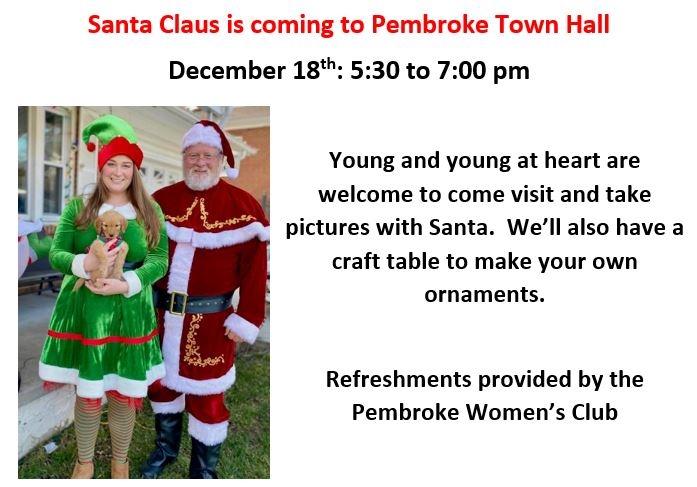 The Town of Pembroke presents A Christmas Celebration with Santa Claus on Monday, December 18, 2023 inside the Pembroke Town Hall.