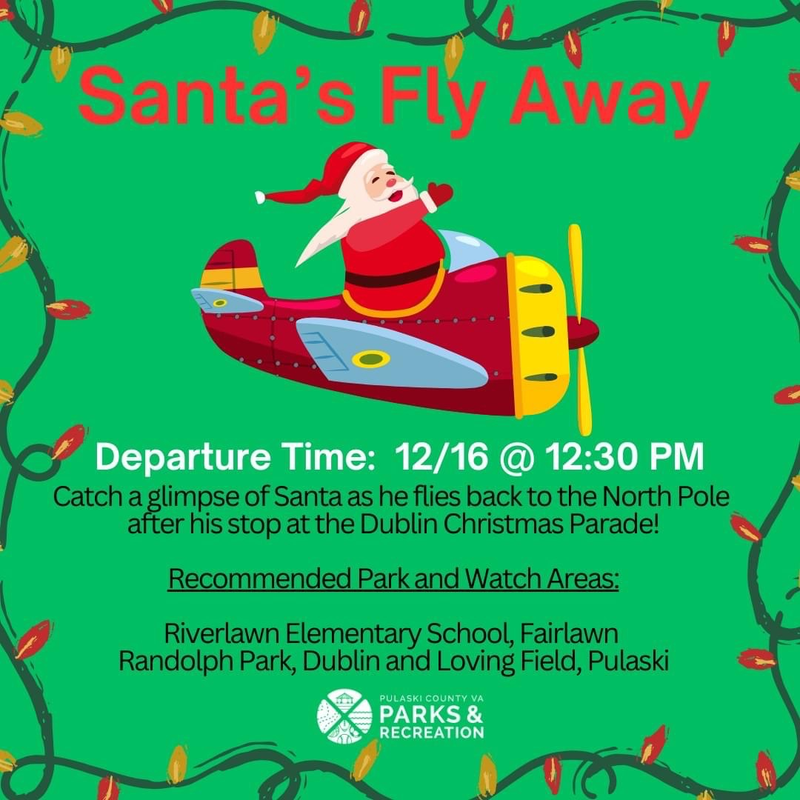 Don't miss Santa's Fly Away following the Dublin Christmas Parade! Santa plans to fly over Pulaski County, Virginia one last time before heading back to the North Pole for Christmas.