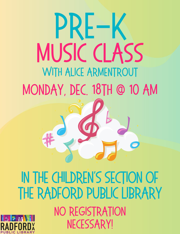 Radford Public Library presents a Pre-K Music Class on Monday, December 18, 2023.