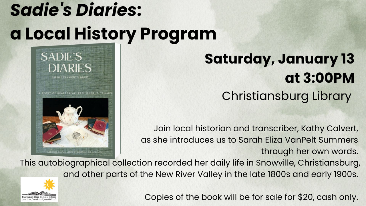 The Christiansburg Library presents Sadie's Diaries: a Local History Program on Saturday, January 13, 2024.