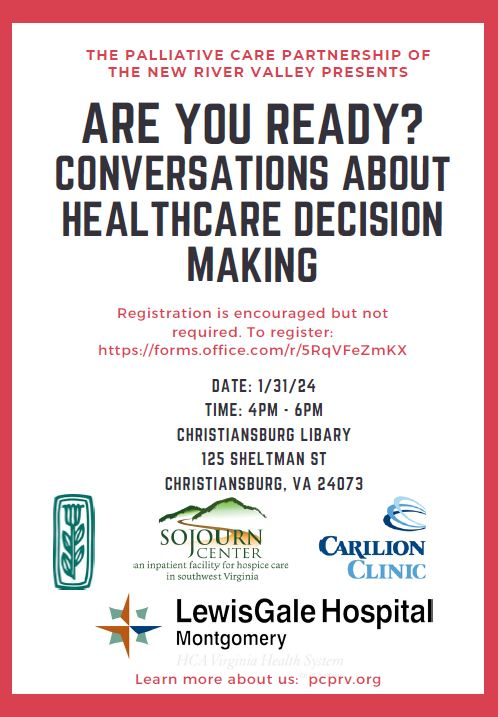 The Palliative Care Partnership Of The New River Valley and the Christiansburg Library presents the program "Conversations about Health Care Decision Making" on Wednesday, January 31, 2024 at the Christiansburg Library.