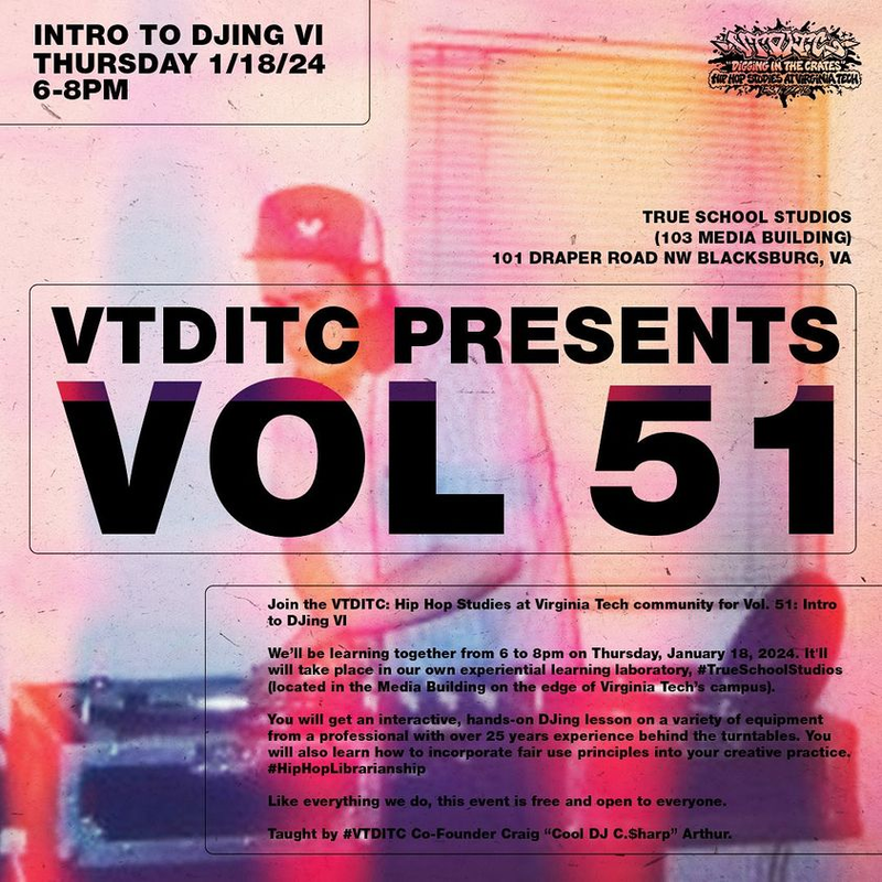#VTDITC: Hip Hop Studies at Virginia Tech presents #VTDITC Vol. 51: Intro to DJing VI on Thursday, January 18, 2024 in #VTDITC's studio, True School Studio, located within the Virginia Tech Media Building in room 103 on the campus of Virginia Tech.