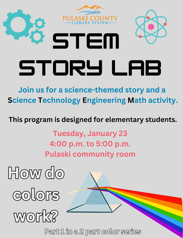 The Pulaski County Library presents the STEM Story Lab with the theme "How Do Color Work?" on Tuesday, January 23, 2024.