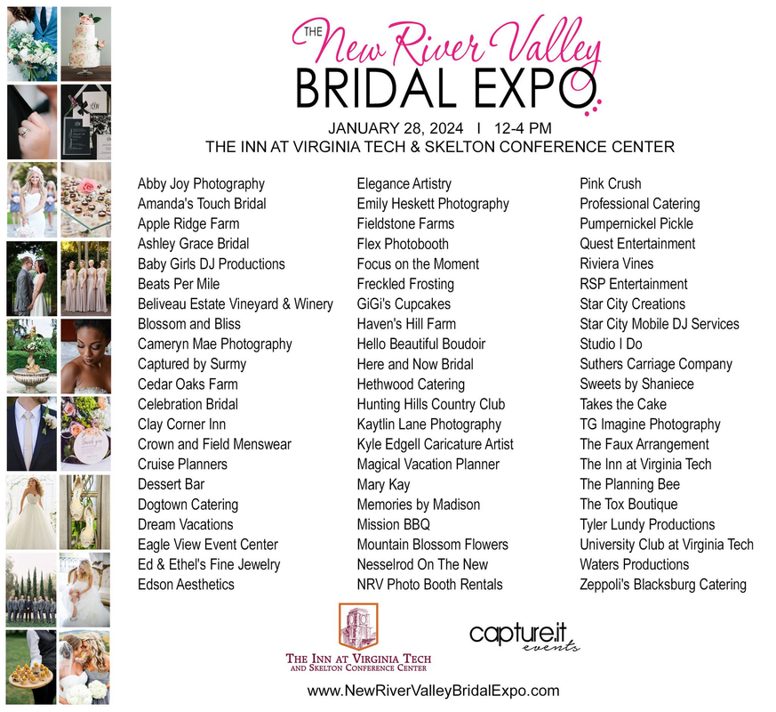 Capture It Events presents The New River Valley Bridal Expo 2024 on Sunday, January 28, 2024 at The Inn at Virginia Tech and Skelton Conference Center.
