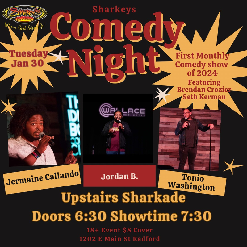 Sharkey's Radford, VA presents a Sharkey's Comedy Night featuring headliner Jermaine Callando on Tuesday, January 30, 2024 upstairs in the Sharkade.