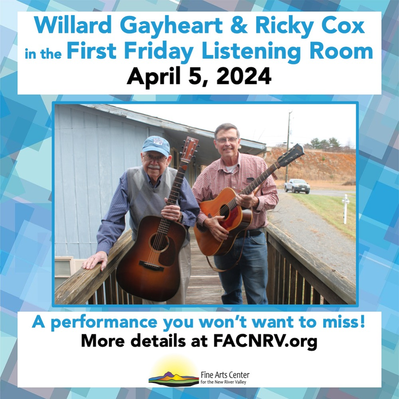 The Fine Arts Center for the New River Valley continues their 2024 First Friday Listening Room Concert Series with their April Concert featuring Willard Gayheart and Ricky Cox on Friday, April 5, 2024.