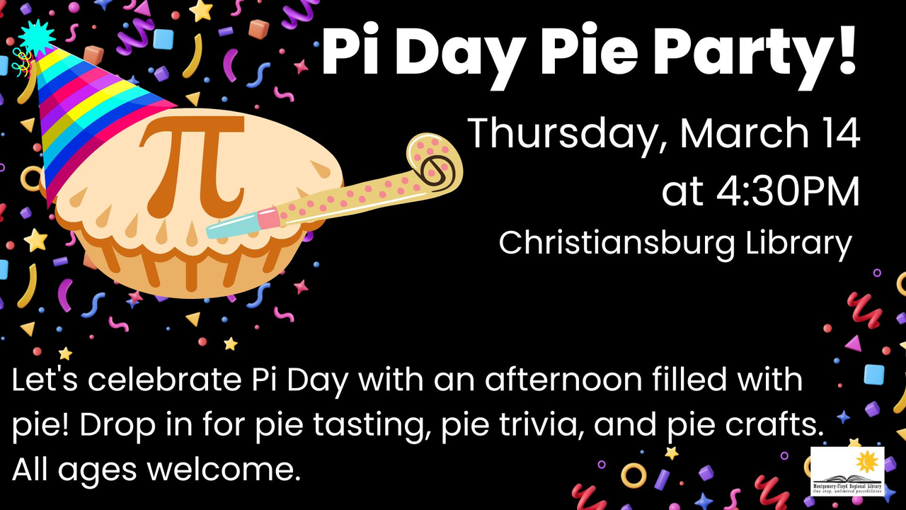 Christiansburg Library presents a Pi Day Pie Party on Thursday, March 14, 2024.