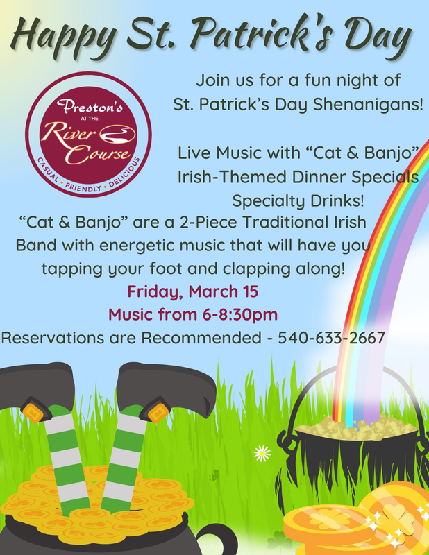 Pete Dye River Course presents St. Patrick's Day Shenanigans with Live Music from Cat & Banjo on Friday, March 15, 2024.