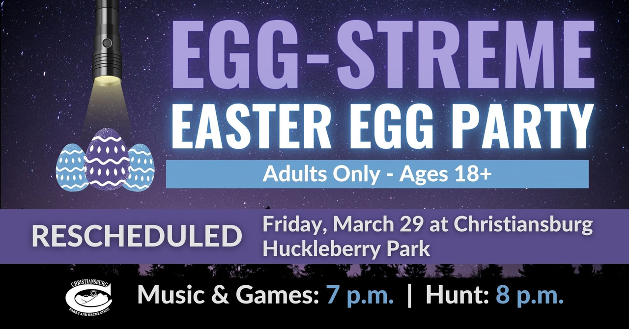 The Christiansburg Department of Parks and Recreation presents the 2024 Egg-Streme Adults Only Easter Egg Party on Friday, March 29, 2024 at Huckleberry Park.