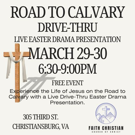 Faith Christian Church presents the "Road to Calvary" Drive-Through Easter Drama Presentation on Friday, March 29, 2024 and Saturday, March 30, 2024 from 6:30 PM to 9:00 PM.