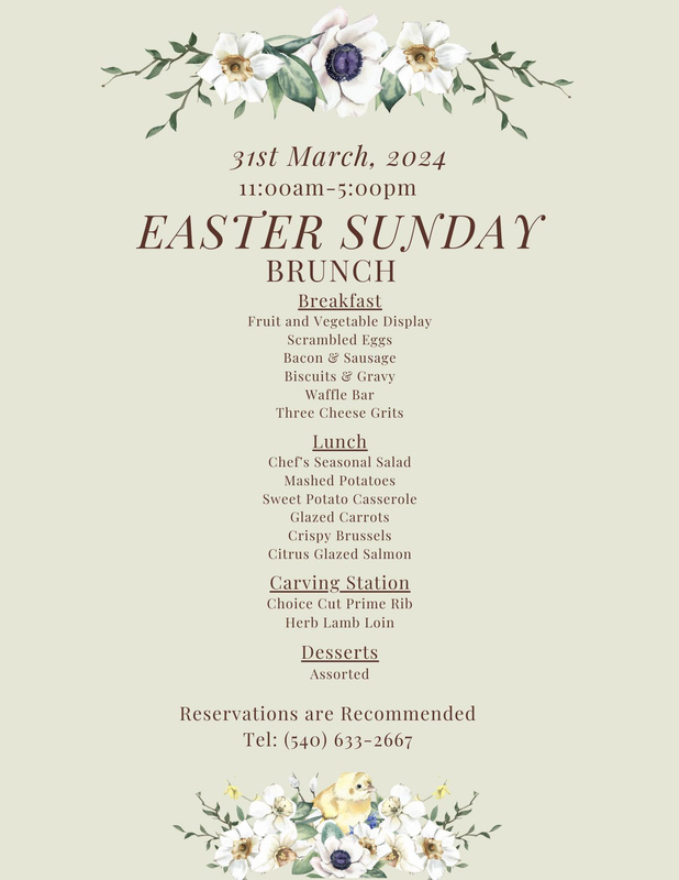 Reservations are recommended. To make a reservation call: 540-633-2667.