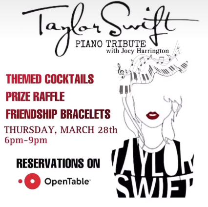 Enjoy a Taylor Swift piano tribute from Joey Harrington along with themed cocktails, prize raffle and friendship bracelets.