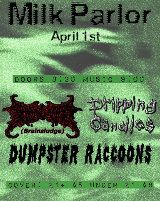 The Milk Parlor presents Three Band Concert with Brainsludge, Dripping Candles and Dumpster Raccoons on Monday, April 1, 2024.