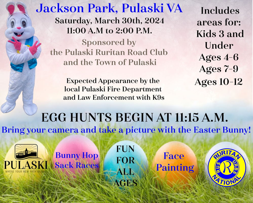 The Town of Pulaski and the Pulaski Ruritan Road Club presents the Pulaski Easter Egg Hunt and Festivities on Saturday, March 30, 2024 at Jackson Park.
