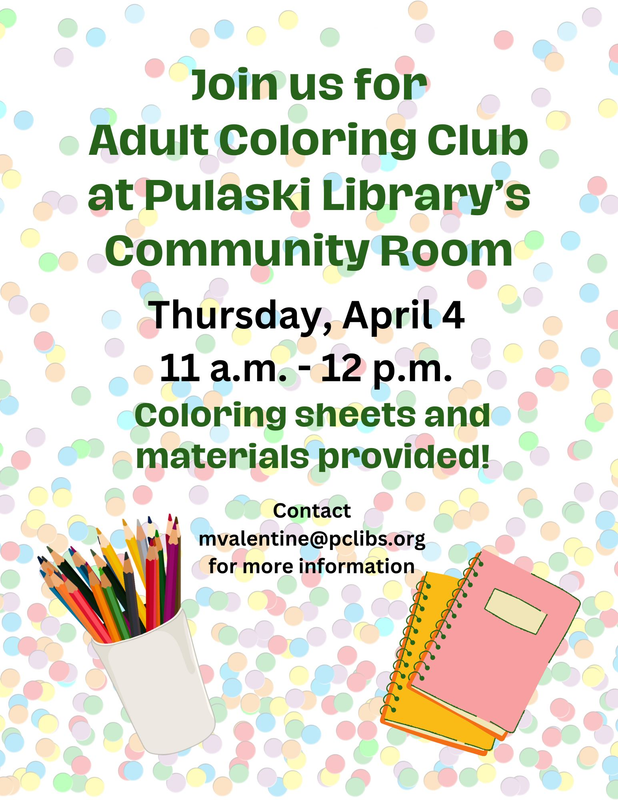 The Pulaski County Library presents Adult Coloring Club on Thursday, April 4, 2024.