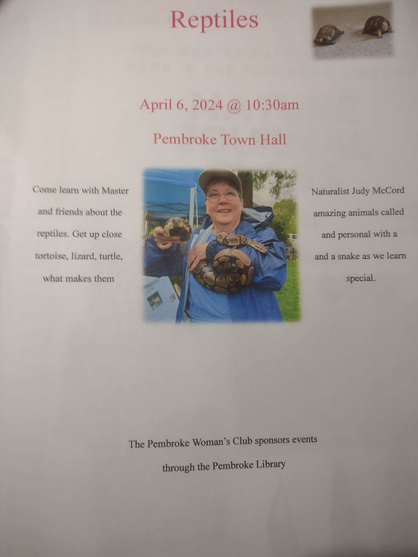 The Pembroke Library and the Pembroke Woman's Club presents a See and Learn Live Reptile Program on Saturday, April 6, 2024 at the Pembroke Town Hall.