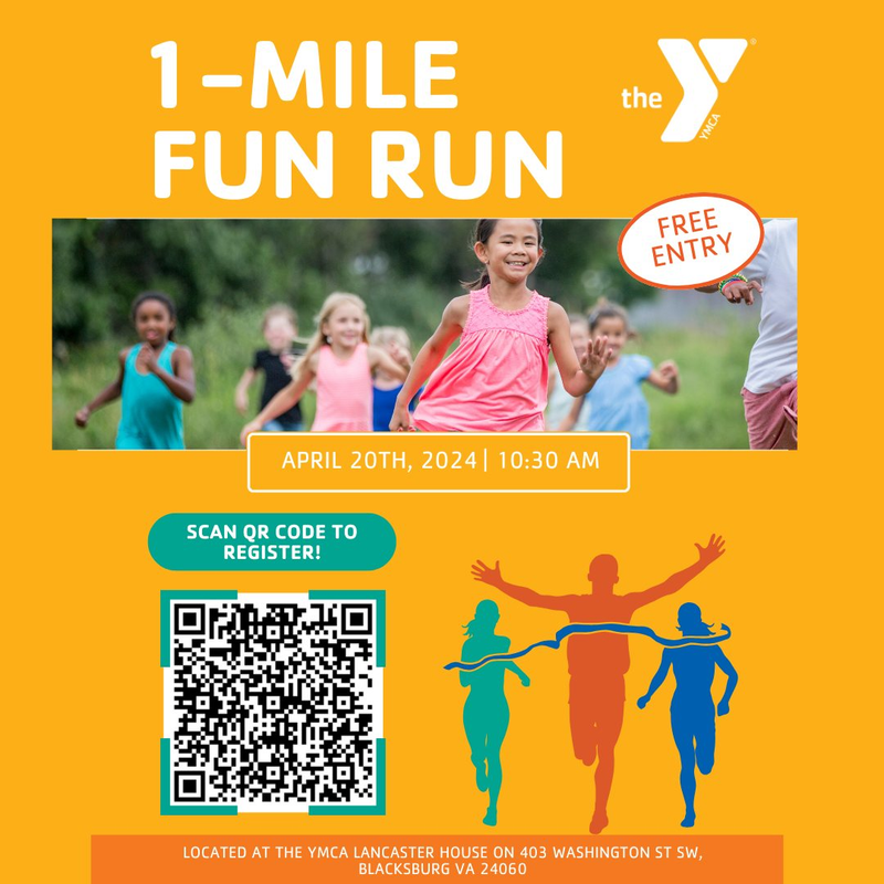 The YMCA at Virginia Tech presents the 3rd Annual 1-Mile Y Fun Run on Saturday, April 20, 2024 starting and finishing at the YMCA Lancaster House next to the campus of Virginia Tech as part of Healthy Kids Day®.