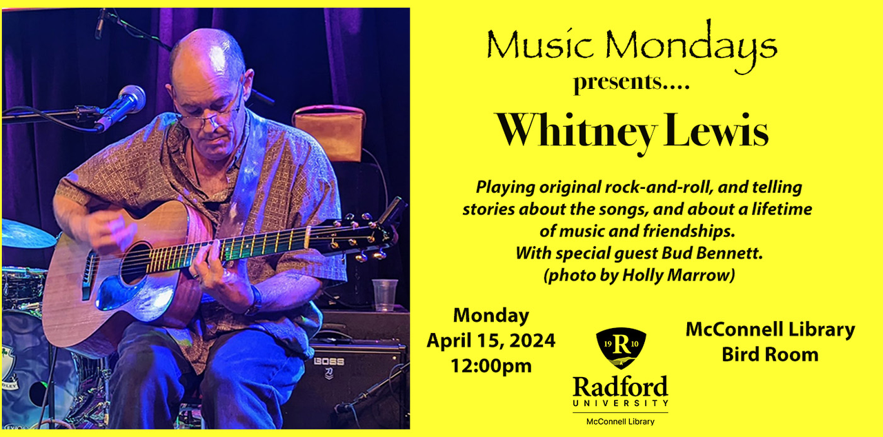 Whitney Lewis, a long time fixture in the New River Valley music scene will be the guest musician in the final Music Monday of this semester. Please join us in the Bird Room to hear original rock-and-roll, to hear the stories behind the songs, and stories of musical friendships that go back 40 years or more. He will be joined by special guest Bud Bennett.