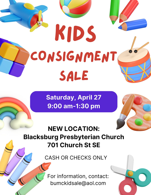Blacksburg Presbyterian Church hosts the Spring 2024 Children’s Consignment Sale on Saturday, April 27, 2024.