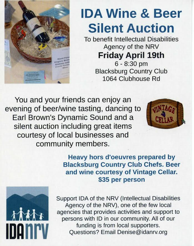 The Intellectual Disabilities Agency of the New River Valley presents their 2024 IDA Wine & Beer Silent Auction on Friday, April 19, 2024 at the Blacksburg Country Club.