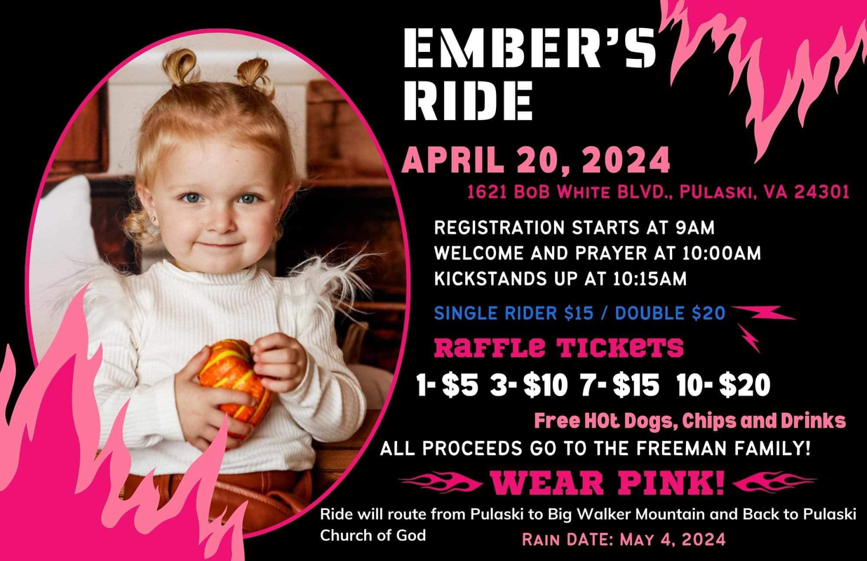 Ember's Ride Fundraiser will be held on Saturday, April 20, 2024 starting and ending at the Pulaski Church of God.