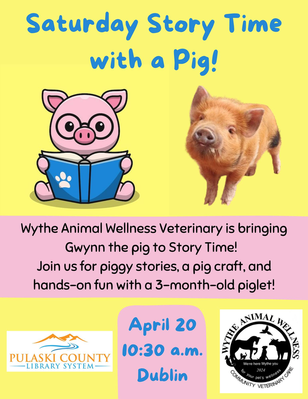 Gwynn the Piglet is coming to Story Time! Wythe Animal Wellness Veterinary is bringing Gwynn, a three month old piglet to the Dublin library. Join us for piggy stories, a pig craft, and hands-on fun with a cute piglet!