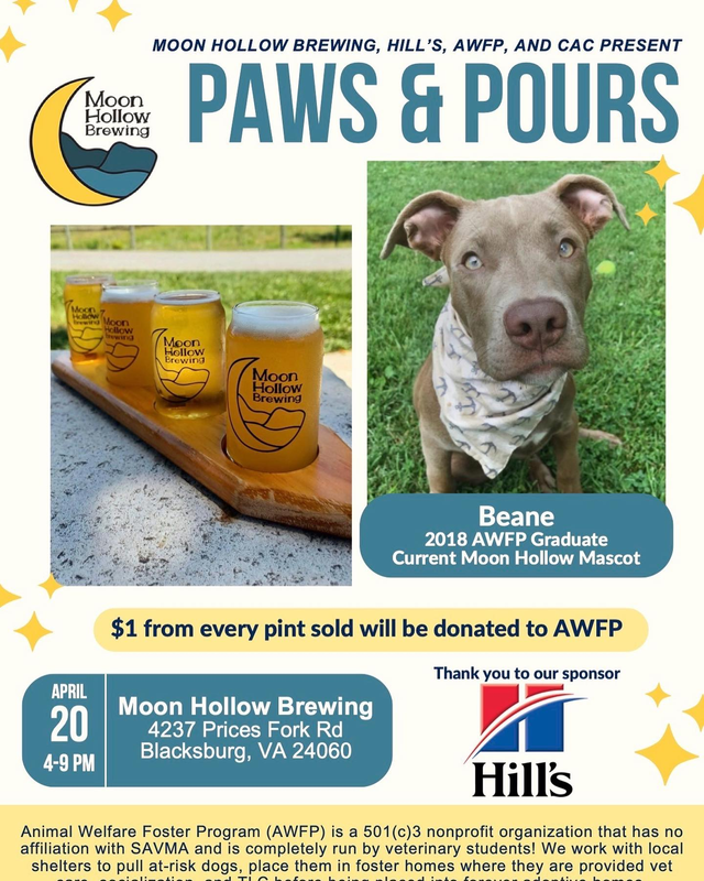 Moon Hollow Brewing presents the Paws & Pours event for the Animal Welfare Foster Program on Saturday, April 20, 2024.