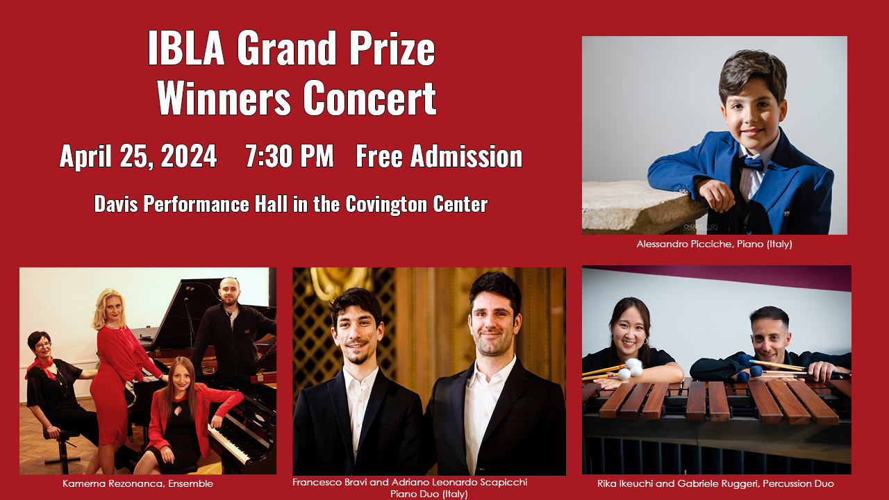 The Radford University College of Visual & Performing Art presents the 2024 IBLA Grand Prize Winners Performance Concert on Thursday, April 25, 2024 inside Performance Hall within the Covington Center on the campus of Radford University.