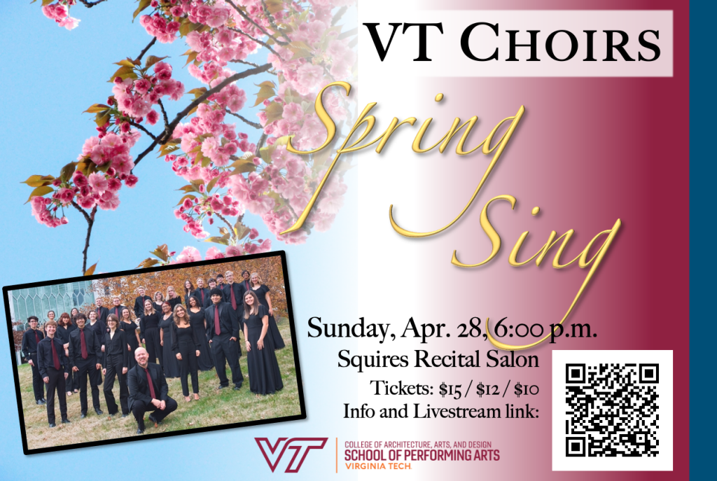 The Virginia Tech School of Performing Arts presents the Virginia Tech Choirs Spring Sing on Sunday, April 28, 2024 inside the Squires Recital Salon located within the Squires Student Center on the campus of Virginia Tech.