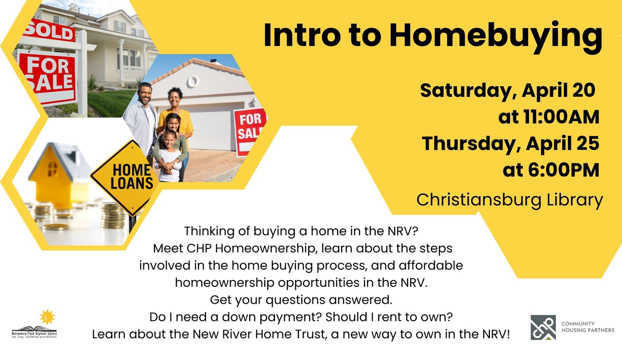 The Christiansburg Library presents the program "Intro to Homebuying" on Thursday, April 25, 2024.