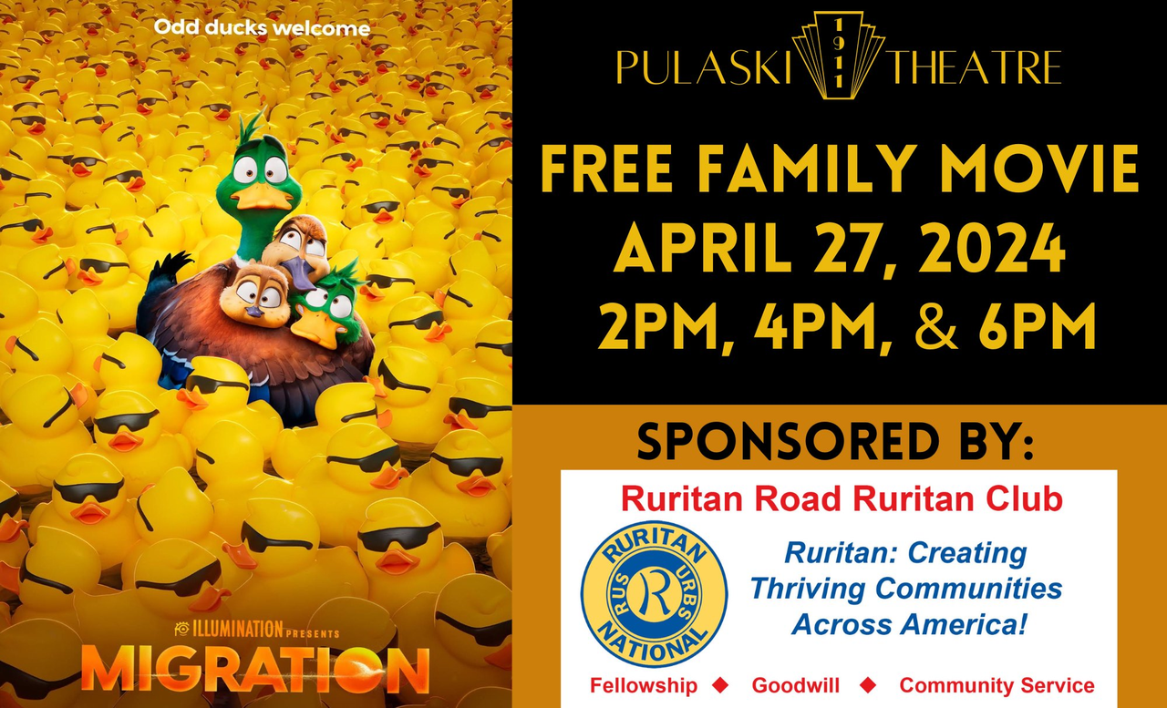 The Pulaski Theatre and the Ruritan Road Ruritan Club presents a Free Family Movie showing "Migration" on Saturday, April 27, 2024 with three showings starting at 2:00 PM, 4:00 PM and 7:00 PM.