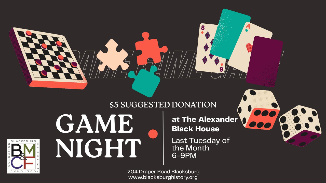 The Alexander Black House & Cultural Center presents a Game Night on Tuesday, April 30, 2024.