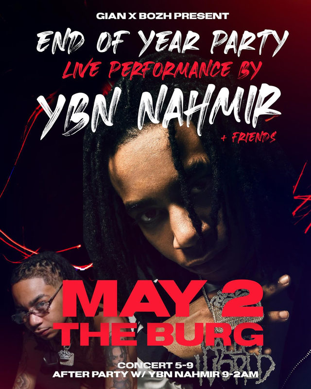 The Burg and Gian X Bozh present the End of The Year Party with Live Performance by YBN Nahmir and Friends on Thursday, May 2, 2024 at The Burg.